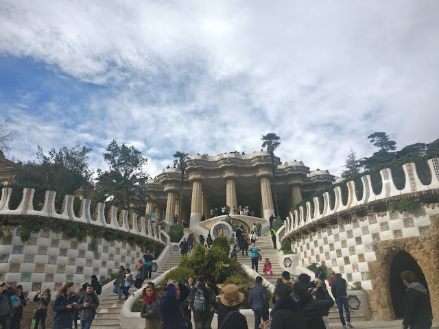 Park guell is located at a high altitude. To get there I had to use multiple escalators which was situated between two neighbourhood and rest of the way by walking that leads to the foot of the stairs of park guell. I climbed the stairs to the breathtaking view of Barcelona. Park is pretty vast and beautiful. I spend my time in the park by climbing the rocks, getting down them, listening street music, watching beautiful paintings by roadside artists, relaxed for a while on Gaudi designed mosaic benches with the gorgeous view to look at, clicked pic of the famous lizard (El Drac), bought souvenirs from the shop. I had a nice time there. Keep aside at least 2 hours to visit this gorgeous park. I bought the entry ticket to park on the spot.